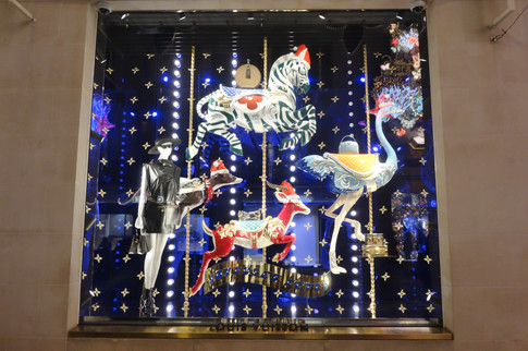 Louis Vuitton on Bond Street in Mayfair, London celebrates the festive season with Joyeuses Fetes their Happy Holidays Christmas theme presenting a bright, colourful and mirrored display featuring a carousel of animal characters and LV flower symbols in a series of windows moving across the front of the store...with on trend seasonal accessories and fashion amongst the carnival rides it's the most stylish fun in town!