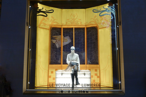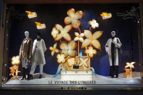 Louis Vuitton on Bond Street in Mayfair, London presents Les Voyage de Lumieres or Voyage of Light for Christmas with illuminated lanterns discovering a world of wonder sees trunks with wings travelling across the skies embarking on an enchanting season of joy...weaving a spell across the landscape the starlit sky showcases luxury fashion and gift giving with the iconic floral logo coming into fruition!